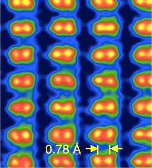 Snímek krystalu křemíku, na kterém jsou vidět atomy vzdálené od sebe 0,078 nm