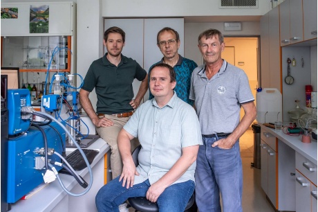 Autorský tým z Ústavu chemických procesů AV ČR s prototypem nového elektrolyzéru
