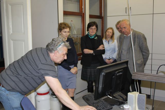 Po diskusi s vedením Akademie věd následovala prohlídka pracoviště a jeho laboratoří. Na oddělení neotektoniky a termochronologie se mimo jiné vědci zaměřují na časoprostorové rekonstrukce a modelování geologických procesů pomocí tzv. termochronologického datování. K tomu jim slouží přístroj Alphachron, který dokáže určit dobu, kdy minerál zchladnul pod určitou teplotu, což lze využít v geologii i archeologii. „Metoda spočívá v měření stopového obsahu hélia, které vzniká radioaktivním rozpadem uranu, thoria a samaria v minerálech, jako je apatit, zirkon apod. Minerály jsou v Alphachronu zahřívány laserem, aby se uvolnilo hélium, jehož obsah pak přístroj změří,“ vysvětluje vedoucí laboratoře Annika Szameitat.