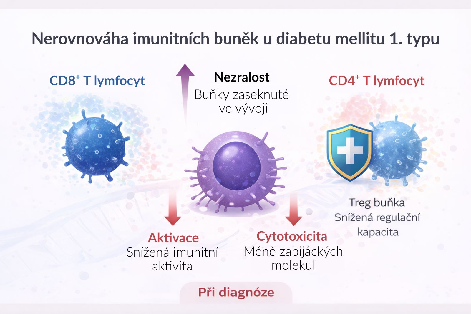 Pomocí moderních metod analýzy jednotlivých buněk vědci podrobně zmapovali lymfocyty (část bílých krvinek) v krvi dětí s diabetem v období krátce po stanovení diagnózy a znovu po jednom roce a porovnali je s jejich zdravými vrstevníky. Ukázalo se, že imunitní buňky dětí s diabetem jsou méně aktivní a vykazují znaky nedostatečné specializace. Tento obraz naznačuje, že imunitní systém není přehnaně agresivní, ale spíše funkčně nezralý.