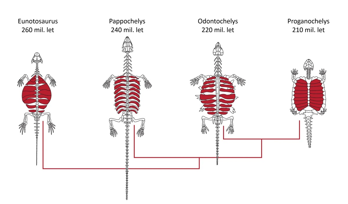 Schéma znázorňující pravděpodobný vývoj želvího krunýře