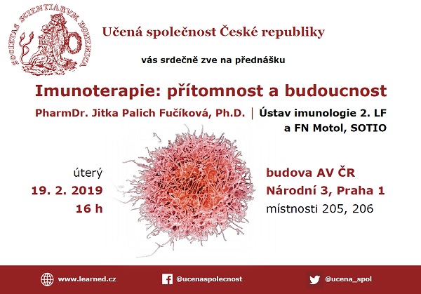 Srdečně vás zveme na přednášku Učené společnosti ČR, která se koná v úterý 19. 2. 2019 od 16:00 v místnostech 205, 206 budovy Akademie věd, Národní 3, Praha 1. Přednášku na téma Imunoterapie: přítomnost a budoucnost pronese PharmDr. Jitka Palich Fučíková, Ph.D. (2. LF a FN Motol, SOTIO).