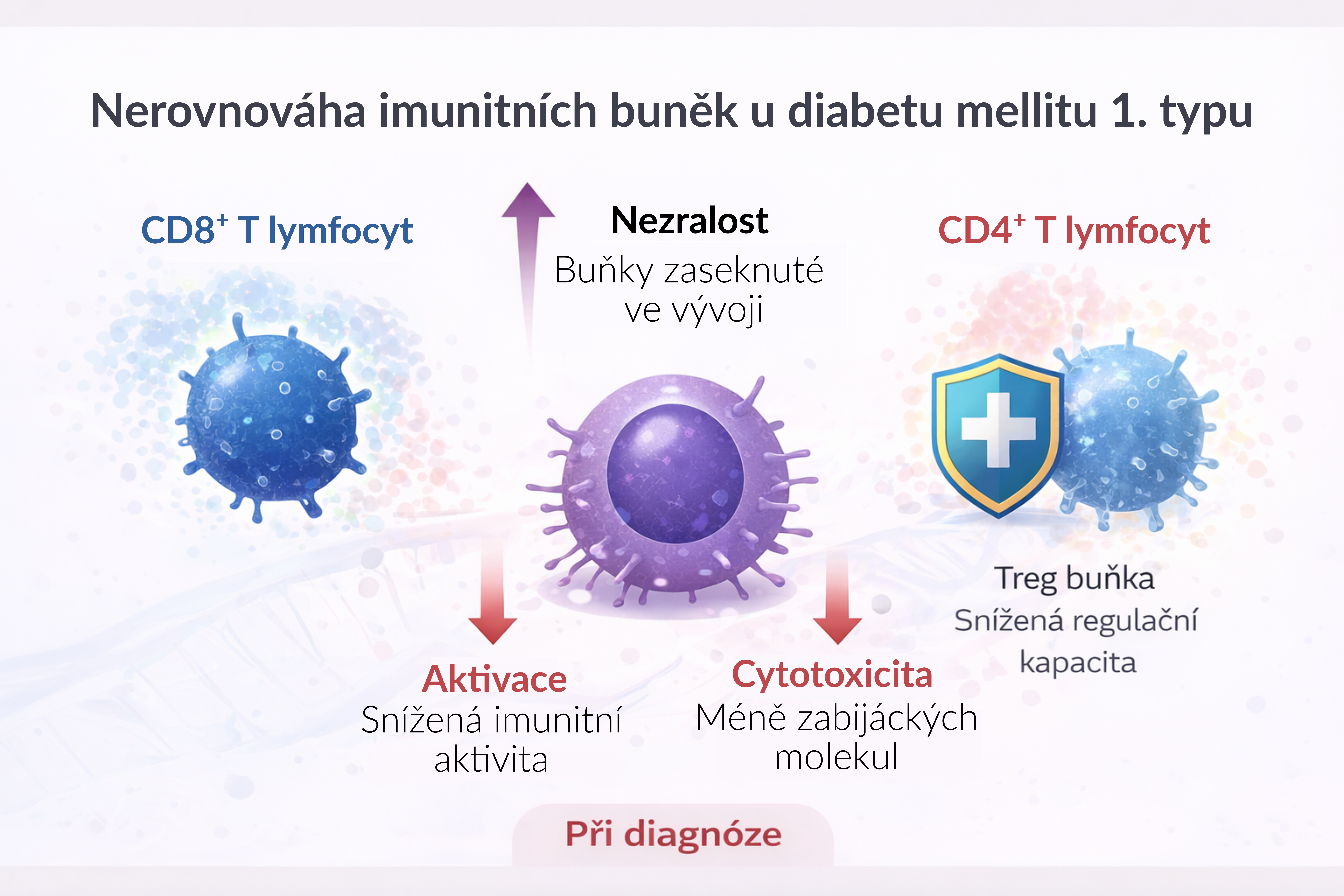 Pomocí moderních metod analýzy jednotlivých buněk vědci podrobně zmapovali lymfocyty (část bílých krvinek) v krvi dětí s diabetem v období krátce po stanovení diagnózy a znovu po jednom roce a porovnali je s jejich zdravými vrstevníky. Ukázalo se, že imunitní buňky dětí s diabetem jsou méně aktivní a vykazují znaky nedostatečné specializace. Tento obraz naznačuje, že imunitní systém není přehnaně agresivní, ale spíše funkčně nezralý.